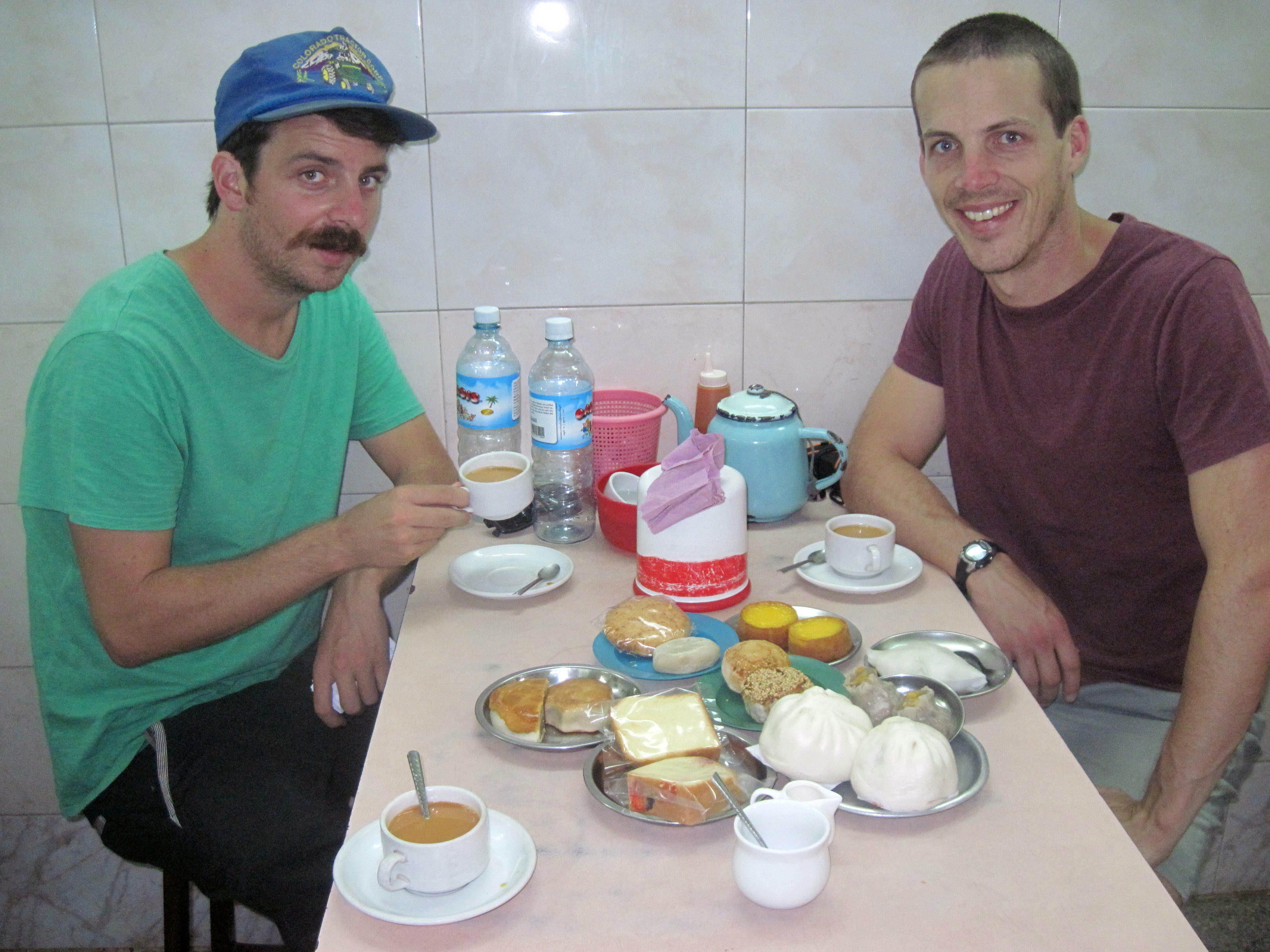 Kiwis Hadyn and Marcus try their first cups of Burmese “le pay yeay”, in a Yangon tea shop. Freshly made snacks – Chinese cookies, pork buns, biscuits and fried dough – accompany the experience.